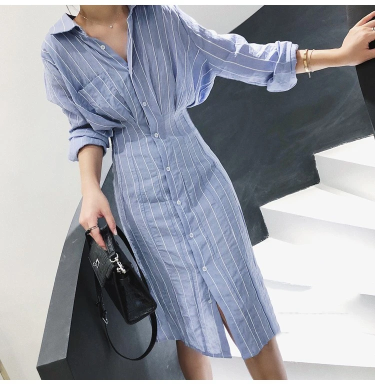 Женское платье в полоску с длинным рукавом, приталенное платье-поло с воротником, однобортное Платье До Колена, офисное платье для леди, бес...