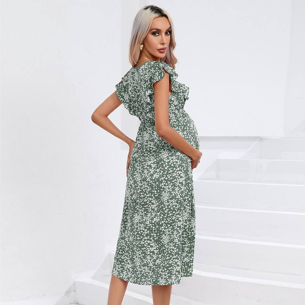 Женское платье для беременных с V-образным вырезом и рюшами и рукавами, летнее повседневное струящееся платье макси с цветочным принтом Kojooin, зеленый