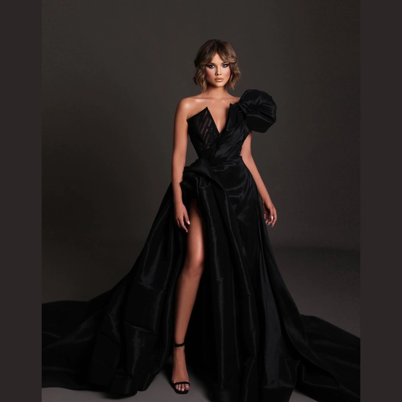 Женское платье для выпускного вечера, черное Плиссированное длинное платье ручной работы с высоким разрезом, вечерние наряды на заказ