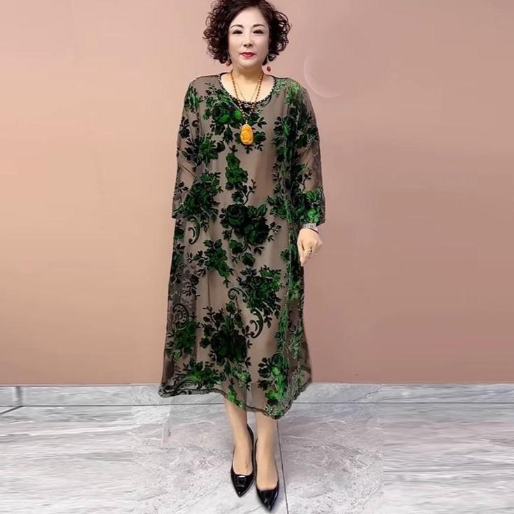 Женское платье из золотого бархата Платье с круглым вырезом и принтом больших размеров Длинные платья с цветочным принтом Весна Осень L