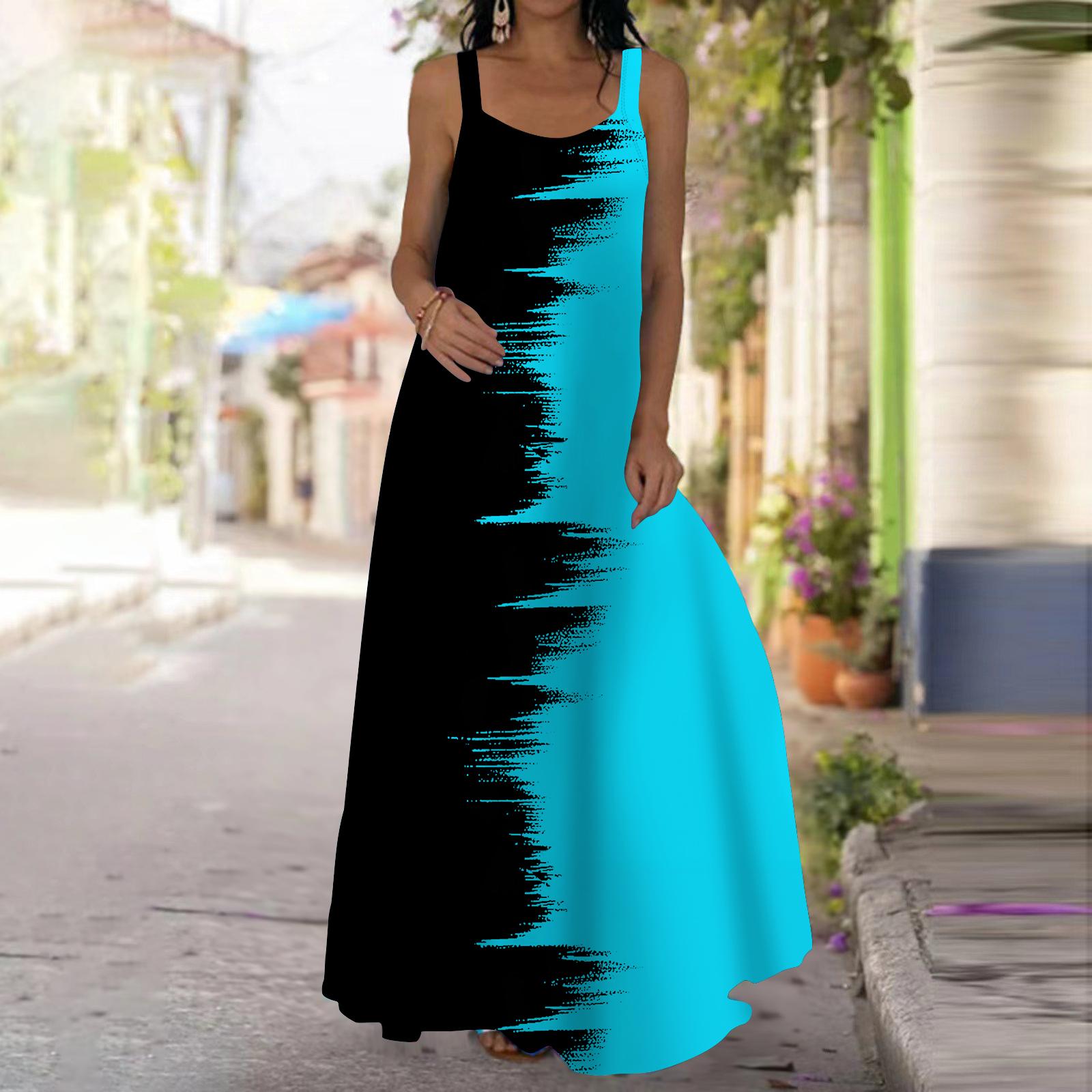 Женское платье-комбинация Длинное платье макси Двухцветное платье с принтом весна-лето с v-образным вырезом для отдыха и отпуска 8XL светло-синий