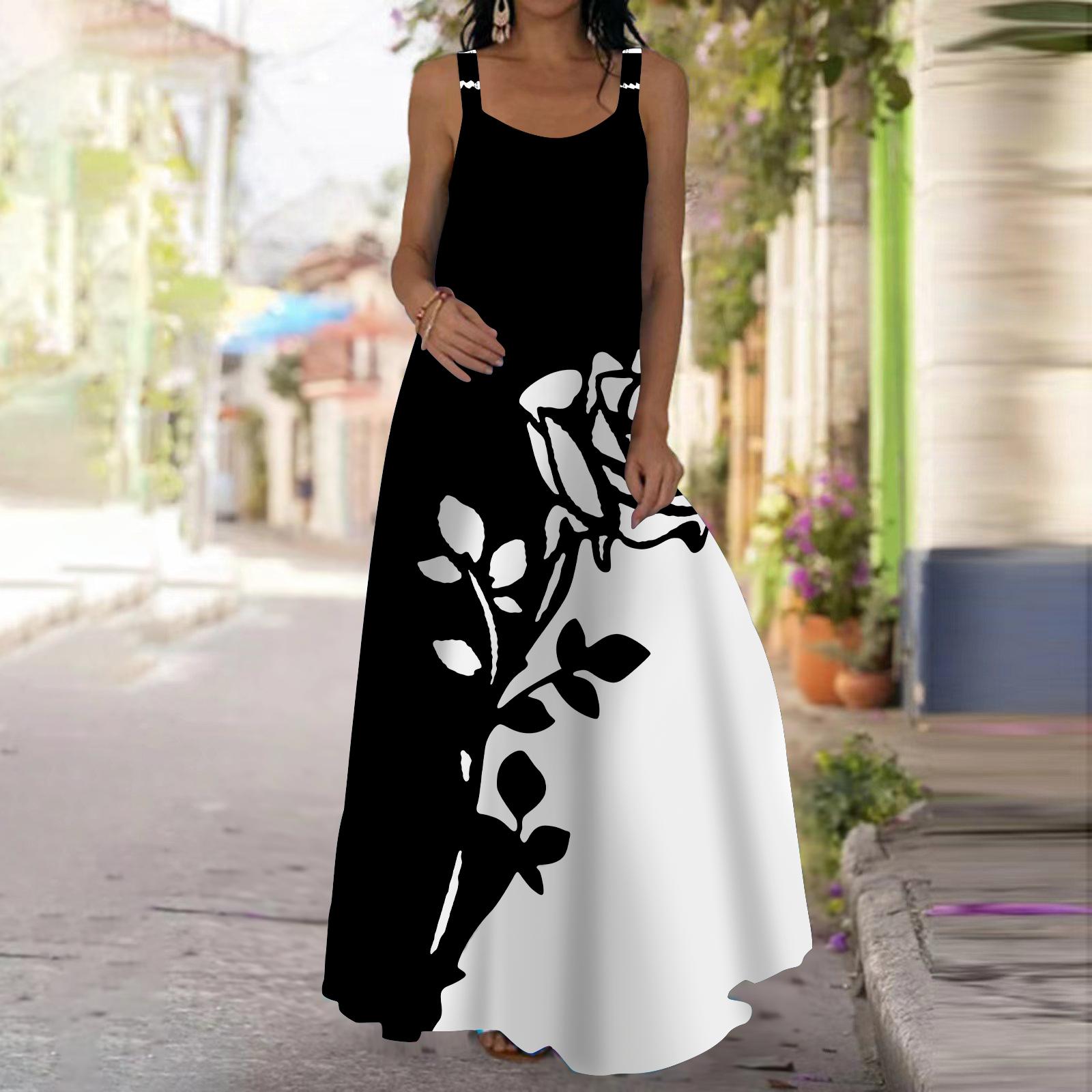 Женское платье-комбинация Длинное платье макси Черное сексуальное платье с принтом роз Весна и лето Для отдыха и отпуска 8XL чёрный