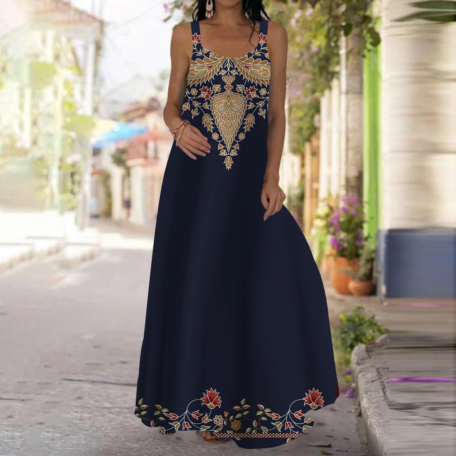 Женское платье-комбинация, длинное платье макси, изысканные узоры, принт, платье для весны и лета, V-образный вырез, для отдыха и отпуска 4XL темно-синий