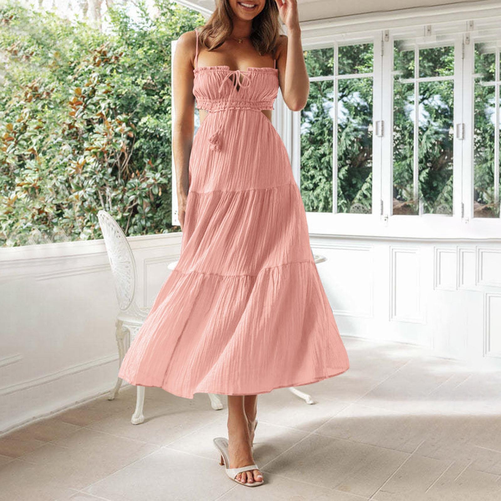 Женское платье-майка, летнее весеннее плиссированное платье в стиле бохо, милое струящееся пляжное платье без рукавов, прямая футболка, платье-майка, платье с круглым вырезом M розовый