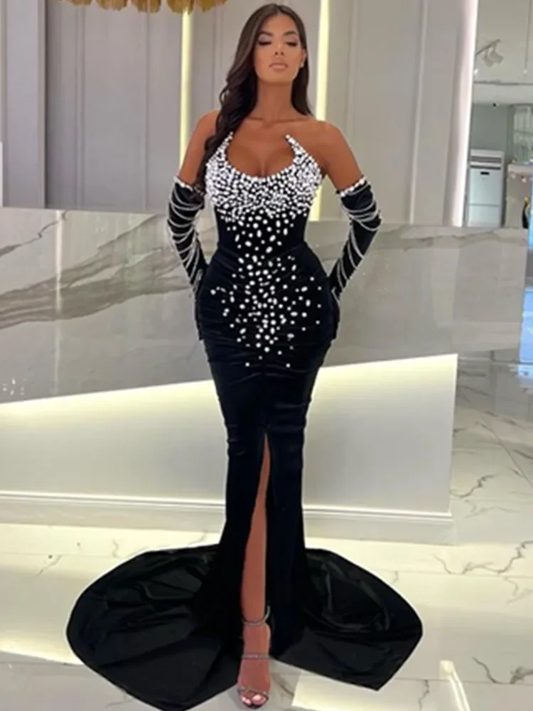 Женское платье-макси без бретелек, Черное длинное платье с жемчужными бусинами и цепочкой, элегантное строгое платье для выступления на сцене, 2023