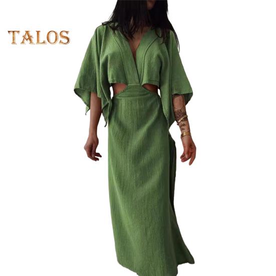 Женское платье макси с V-образным вырезом, сексуальное облегающее платье с коротким рукавом и разрезом, летнее длинное платье из хлопка и льна для пляжного отдыха S
