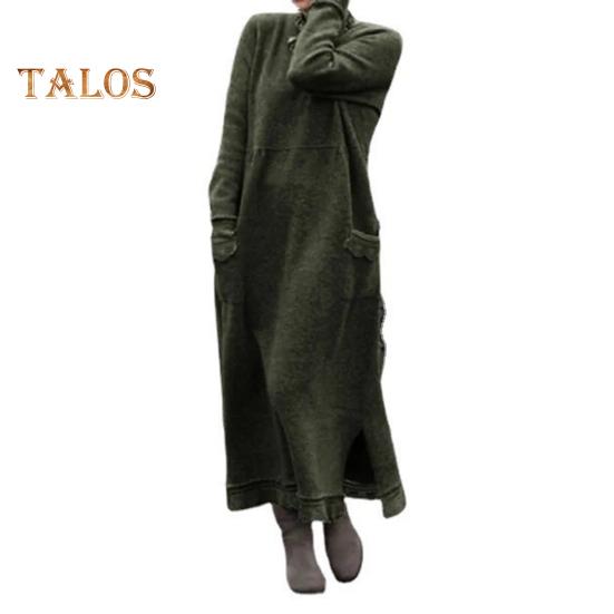 Женское платье осень-весна с карманами, свободные длинные рукава, разрез по низу, чистый цвет, большие размеры, трикотажная кружевная отделка, повседневное платье макси M