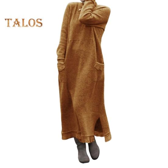 Женское платье осень-весна с карманами, свободные длинные рукава, разрез по низу, чистый цвет, большие размеры, трикотажная кружевная отделка, повседневное платье макси XL