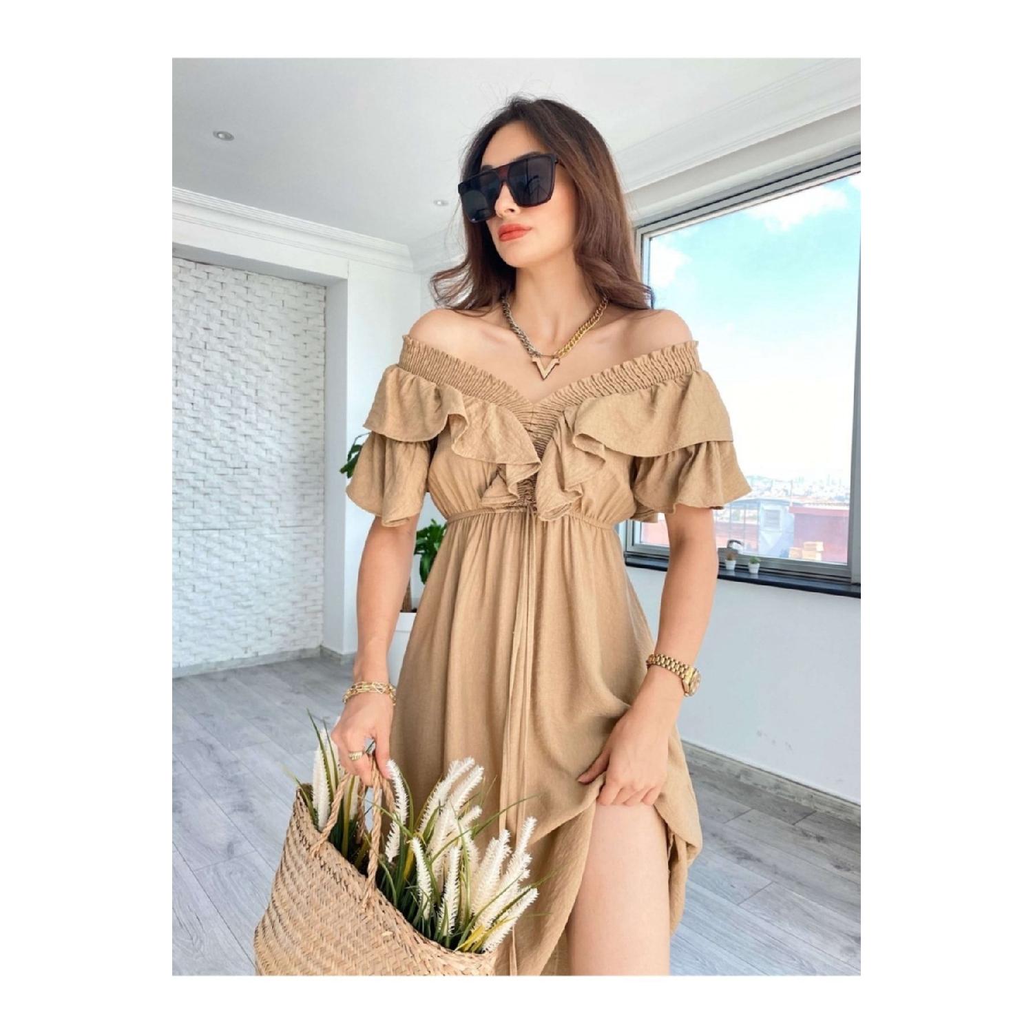Женское платье светло-коричневого цвета с воланами спереди и эластичной резинкой на талии L