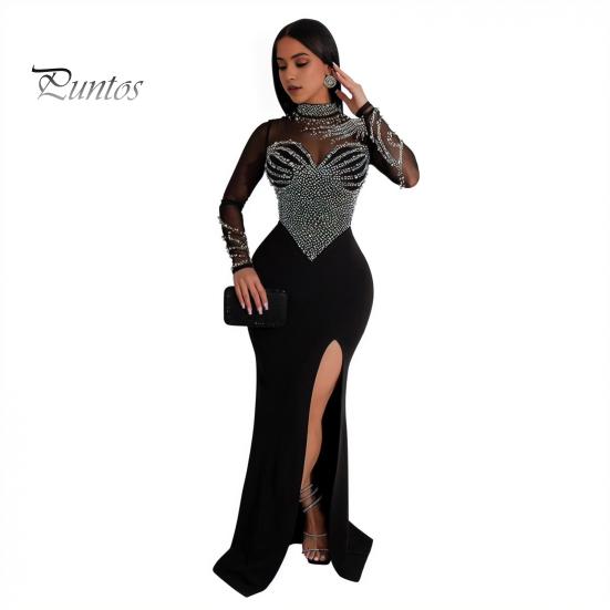 Женское платье с воротником до половины и длинными рукавами, длинное платье с разрезом по бокам, сетчатое платье макси со стразами и разрезом по бокам L чёрный