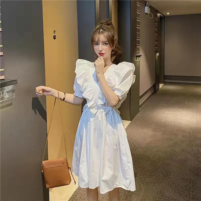Женское платье с оборками, белое пляжное платье с V-образным вырезом, корейское милое праздвечерние чное платье в стиле «лолита», модная оде...