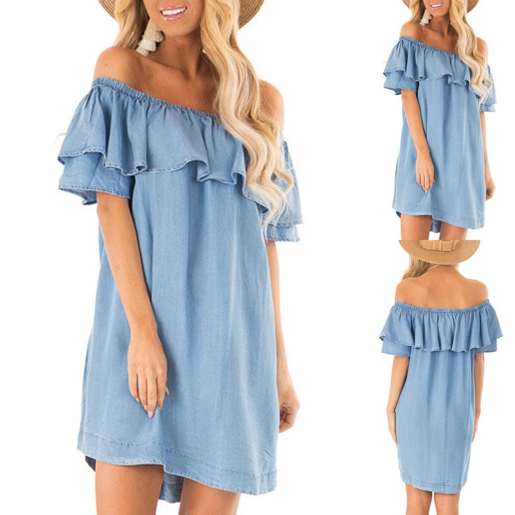Женское платье с открытыми плечами, повседневное короткое мини-платье, однотонное джинсовое пляжное платье