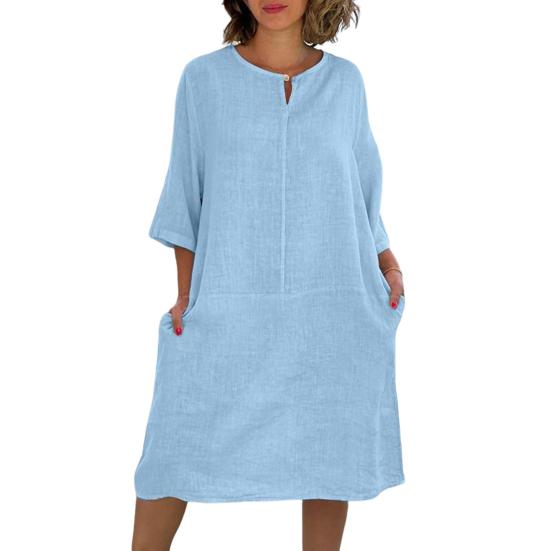Женское платье с половиной рукавом, свободное полое V-образным вырезом, винтажное сплошное цветное платье длиной до колена, тонкие мягкие дышащие карманы, лоскутное женское летнее платье миди
