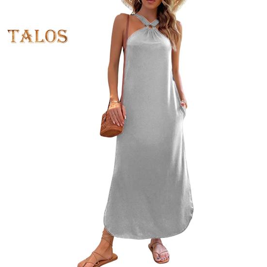Женское платье с халтер-воротом, открытыми плечами, без рукавов, свободное макси-платье с карманами, летнее пляжное платье для отдыха XL светло-серый