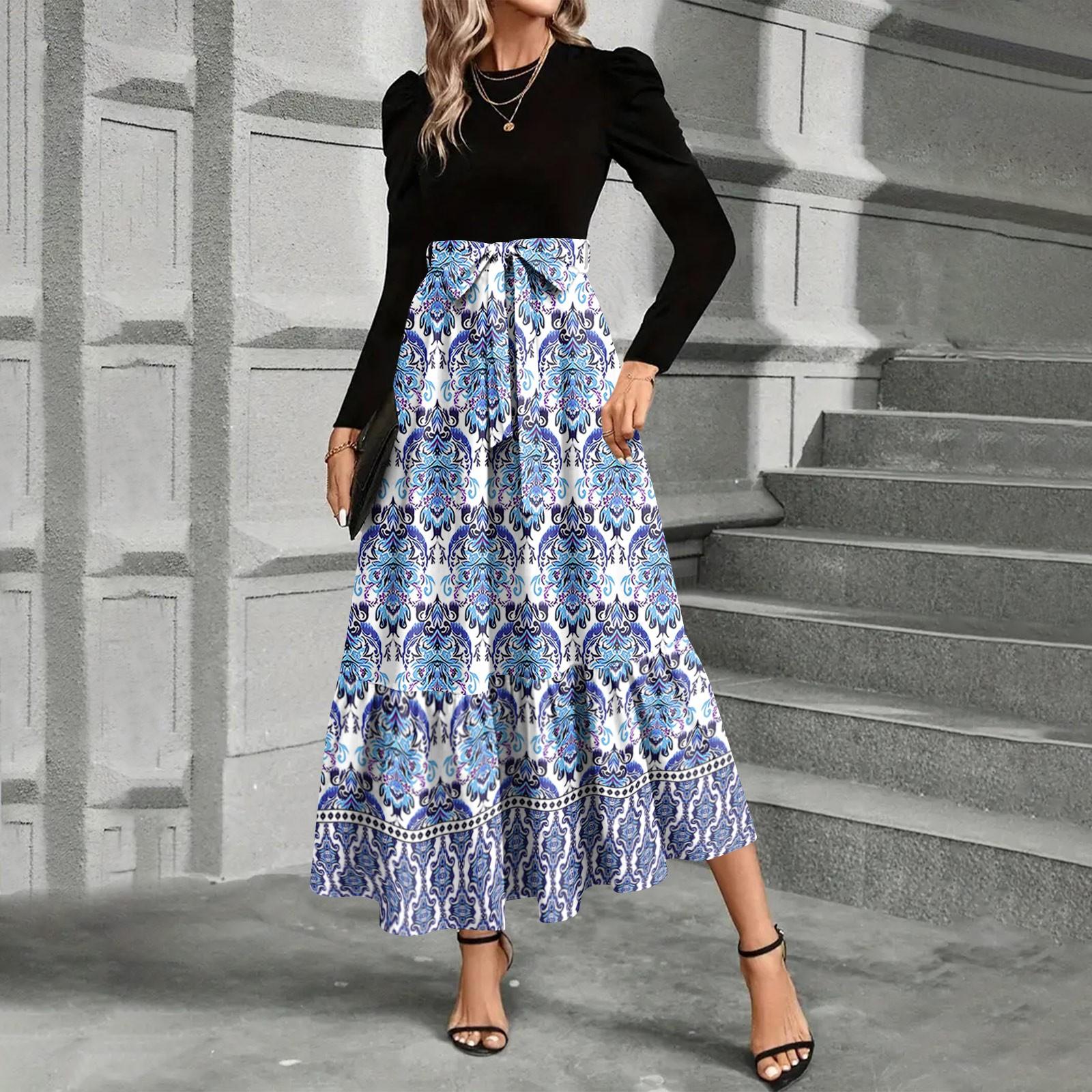 Женское платье с цветочным принтом и высокой талией, модное и элегантное L синий