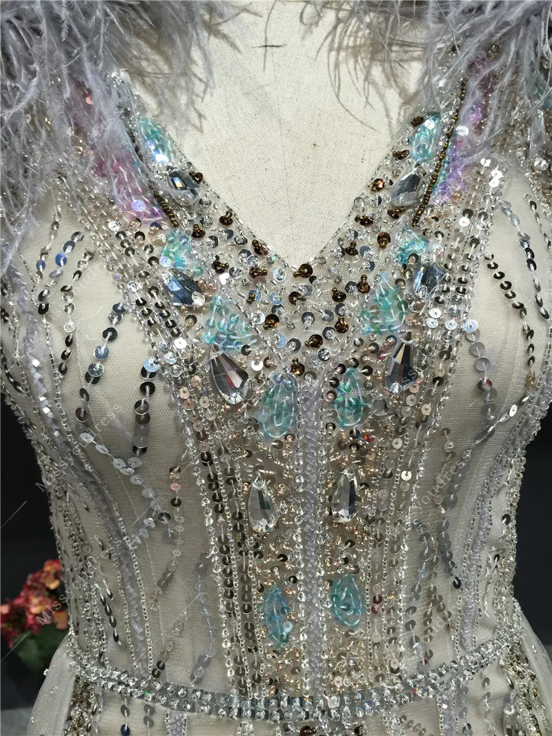 Женское платье с V-образным вырезом, короткое вечернее платье серого цвета со шлейфом и бусинами в форме перьев для торжевечерние мероприят...