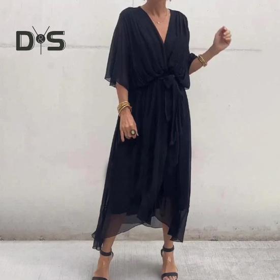 Женское платье с V-образным вырезом, плиссированными, нерегулярными рукавами «летучая мышь», на шнуровке, с высокой талией, однотонное, с рюшами по подолу, с рукавами до середины икры, платье миди для свиданий и поездок на работу 2XL синий