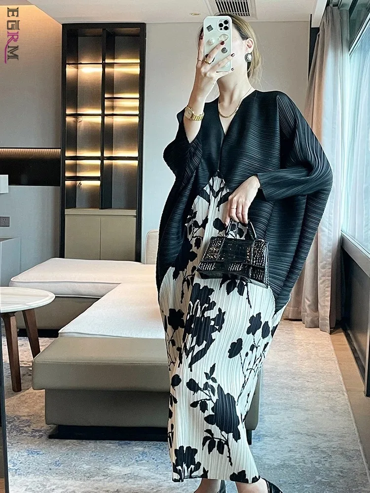 Женское плиссированное платье EGRM, свободное черное платье с рукавами «летучая мышь» и принтом, модель 7GR9264 на осень, 2023