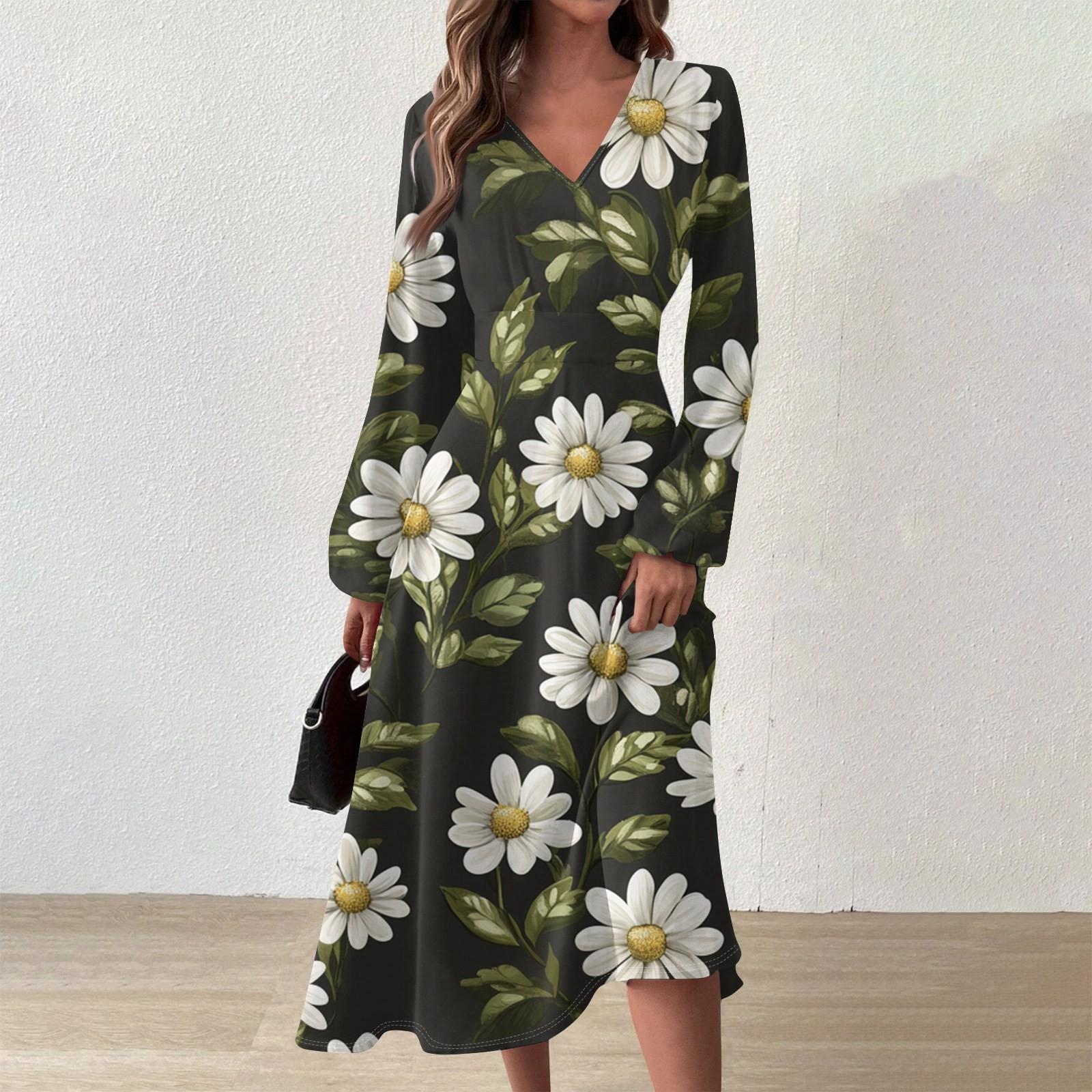 Женское повседневное модное длинное платье с V-образным вырезом и длинным рукавом с цветочным принтом L армия зеленый