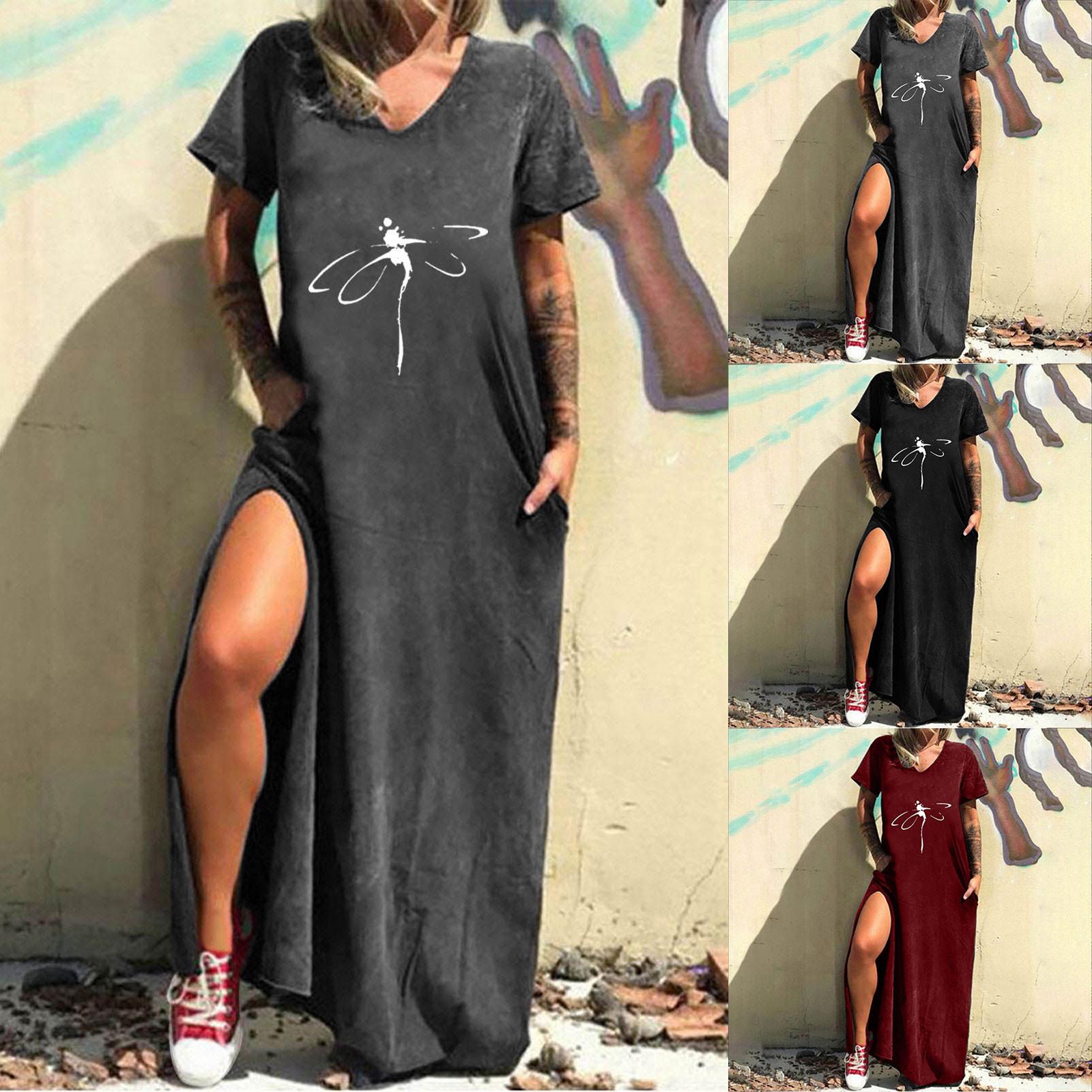 Женское повседневное платье с круглым вырезом и коротким рукавом с длинными разрезами и карманами с принтом