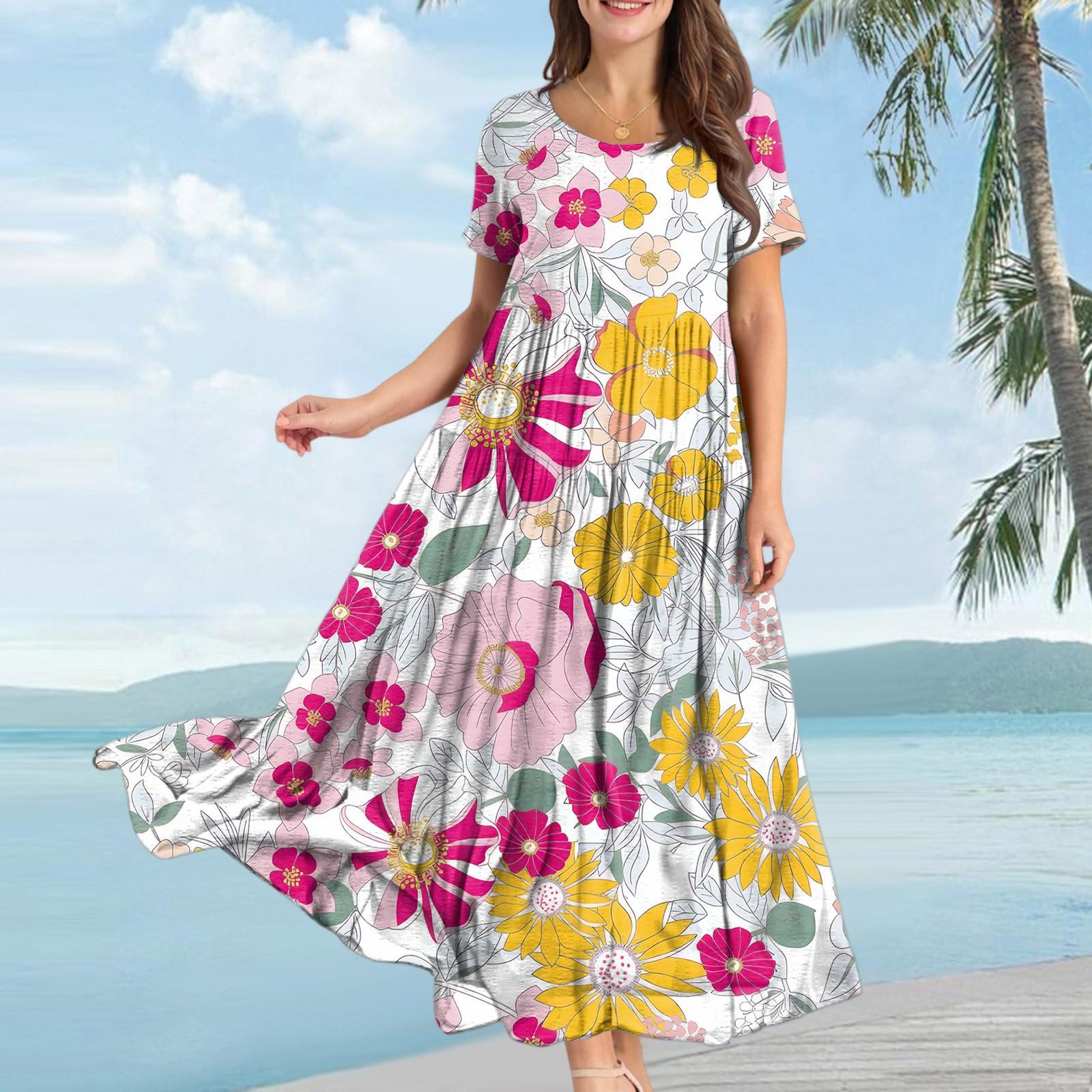 Женское повседневное свободное богемное платье с цветочным принтом, длинное макси-платье с коротким рукавом, летнее пляжное платье-качели L жёлтый