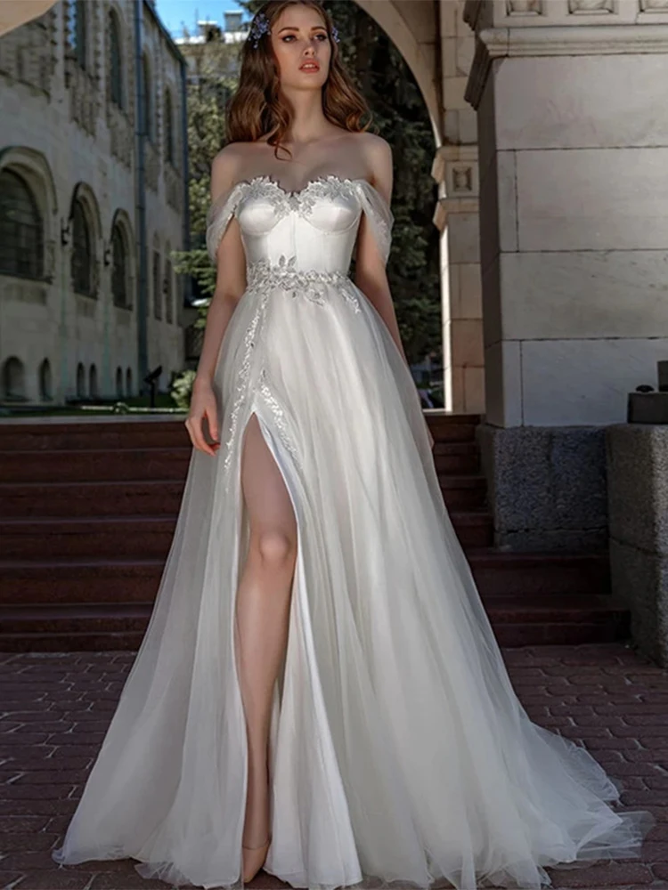 Женское свадебное платье It's yiiya, белое фатиновое платье с открытыми плечами, завязками на спине и разрезом сбоку на лето 2019