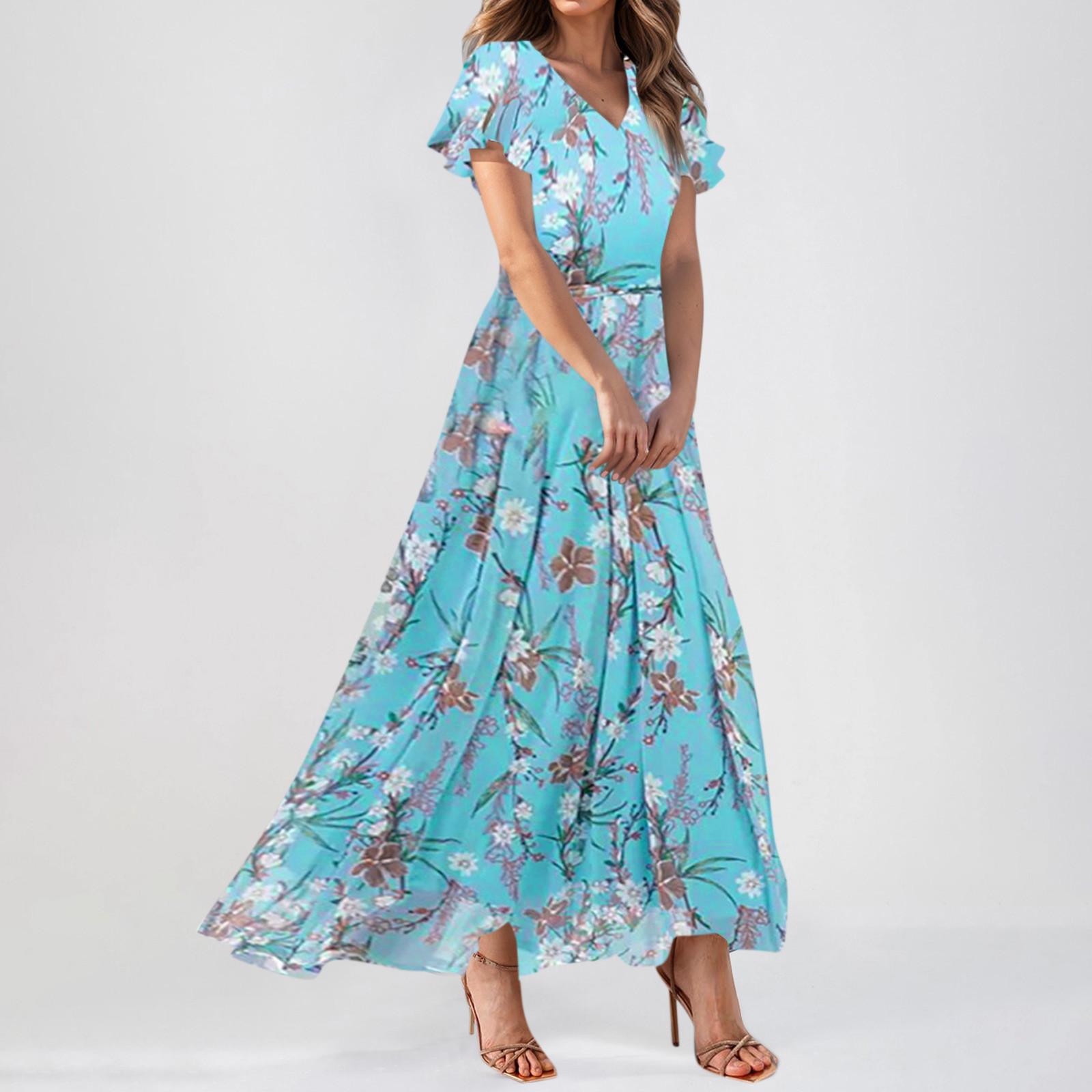 Женское свободное длинное платье с шифоновым цветочным принтом и короткими рукавами с рюшами и V-образным вырезом, модное струящееся платье с талией XL небесно-голубой