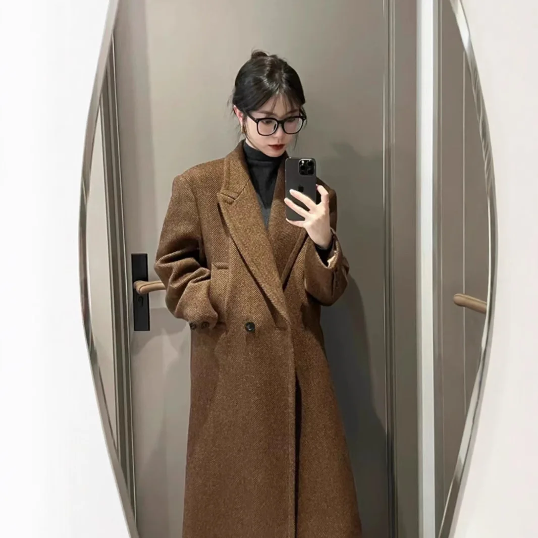 Женское смешанное пальто 2022, осень-зима, новое женское шерстяное пальто с узором «елочка», длинный плащ, теплая верхняя одежда