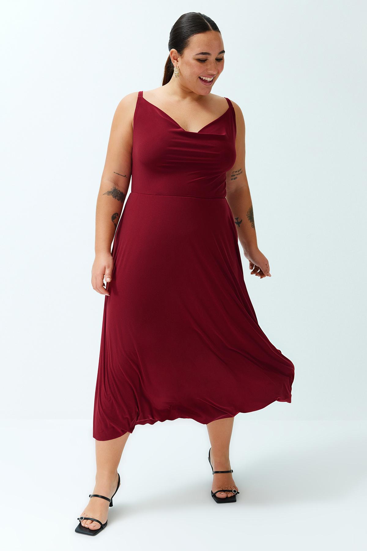 Женское стильное трикотажное платье больших размеров бордового красного цвета с рюшами и воротником 5XL