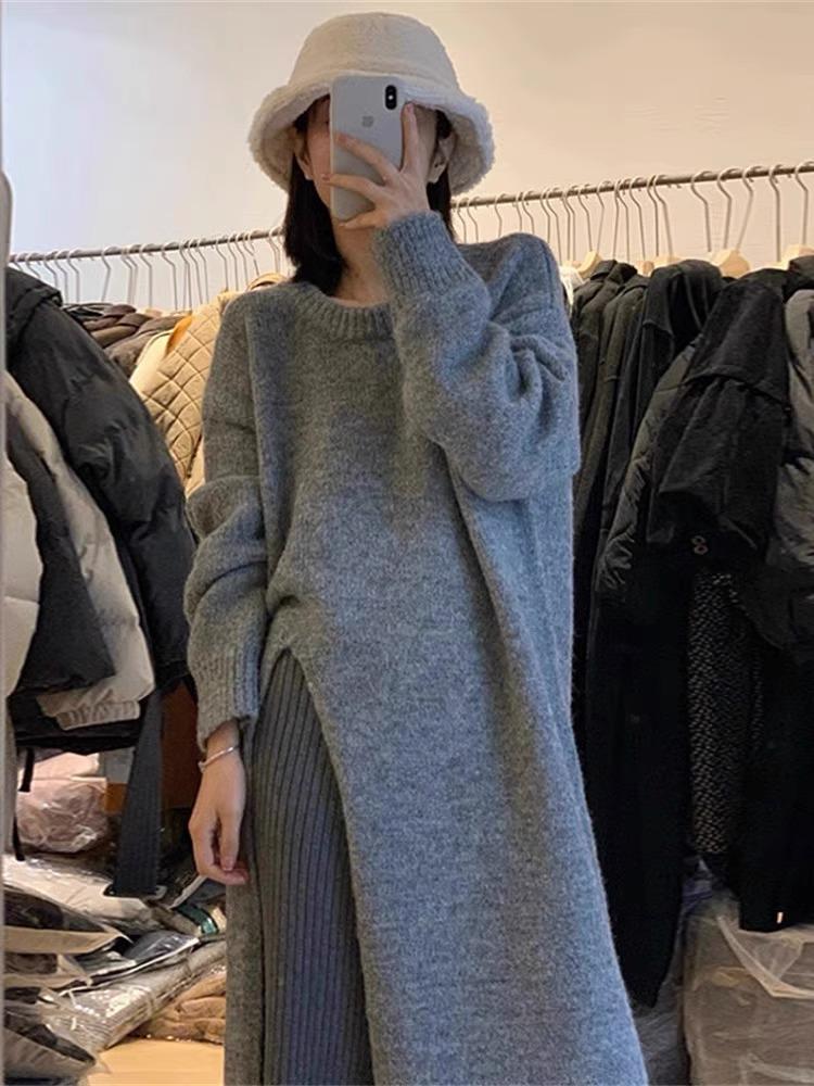 Женское трикотажное платье-свитер средней длины: Ленивый стиль, Круглый вырез, Свободный крой, Боковой разрез, Длина ниже колена, Осень/Зима S