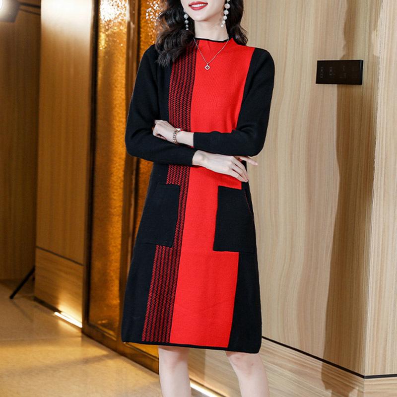 Женское трикотажное платье с шитьем, зимнее ретро, толстое, теплое, модное, с карманами, свободное, толстое, трикотажное платье-свитер One size красный