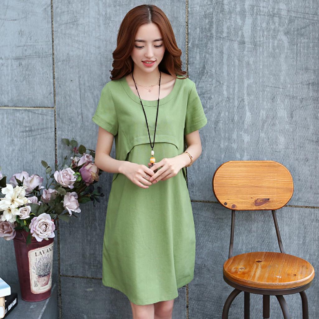 Женское хлопковое льняное однотонное тонкое платье со свободной талией и короткими рукавами большого размера XXXL зелёный