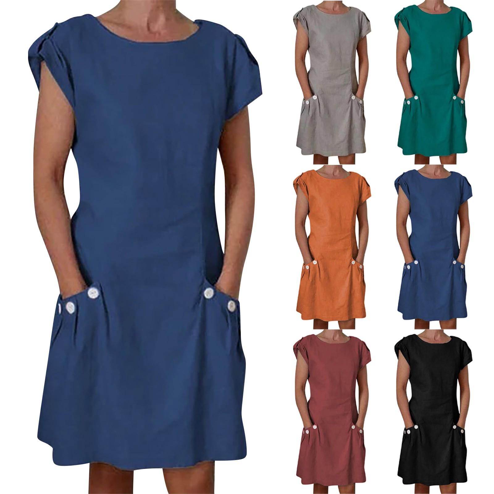 Женское хлопково-льняное однотонное свободное платье с круглым вырезом и короткими рукавами и карманами