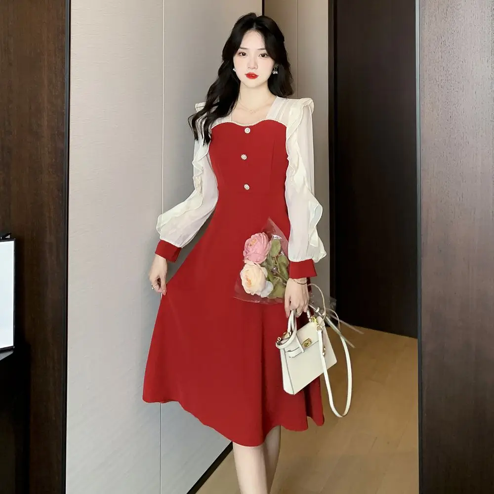Женское цельнокроеное корейское платье, осень 2022, новое офисное платье во французском стиле, женское лоскутное Сетчатое платье с длинным ру...