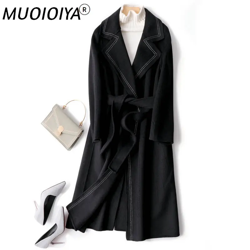 Женское шерстяное пальто, черная Длинная шерстяная куртка с отложным воротником, осенняя кашемировая ветровка, теплая верхняя одежда для ж...
