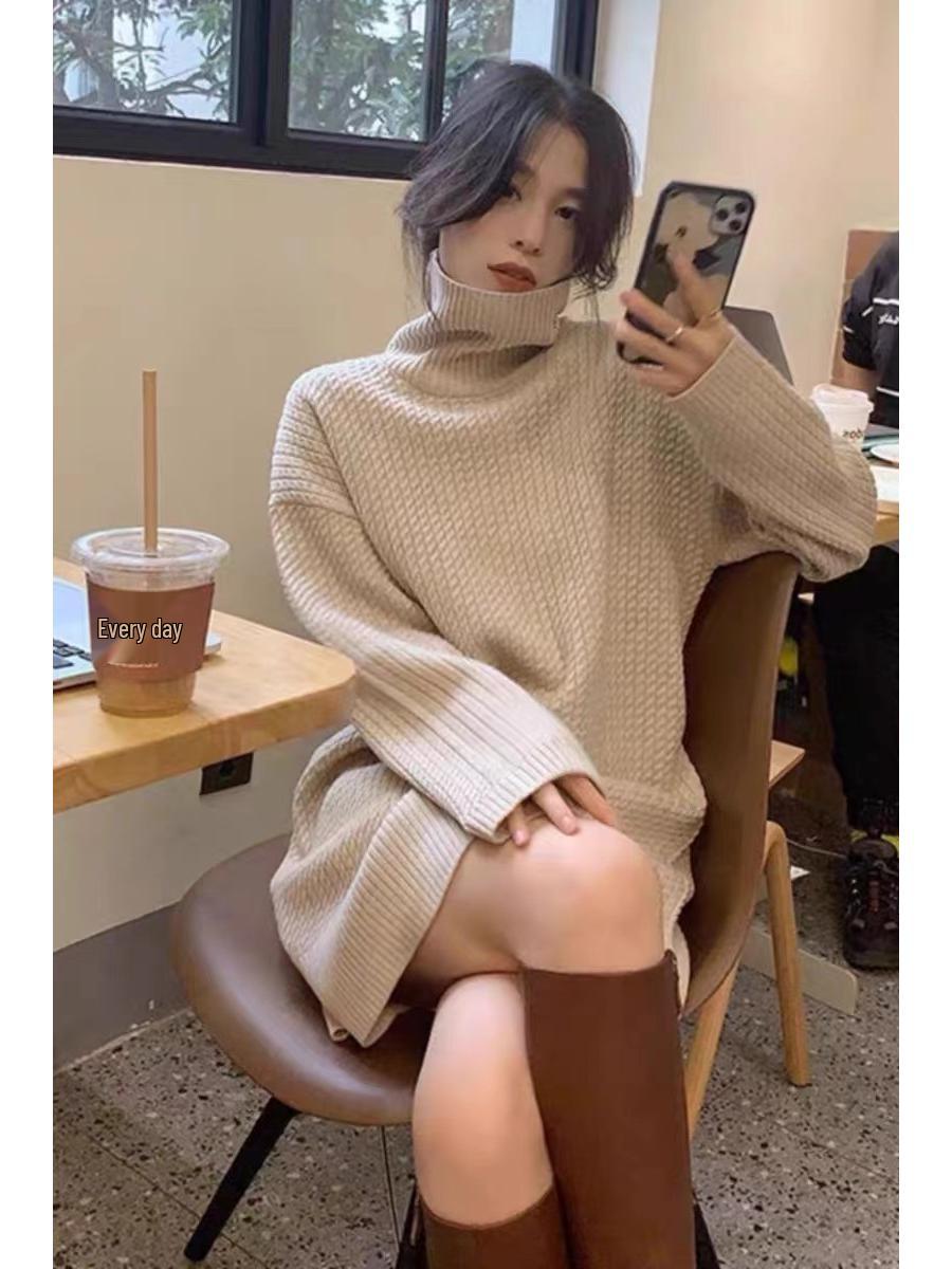 Женское шерстяное платье-свитер миди с высоким воротом - Коллекция Осень/Зима Medium бежевый