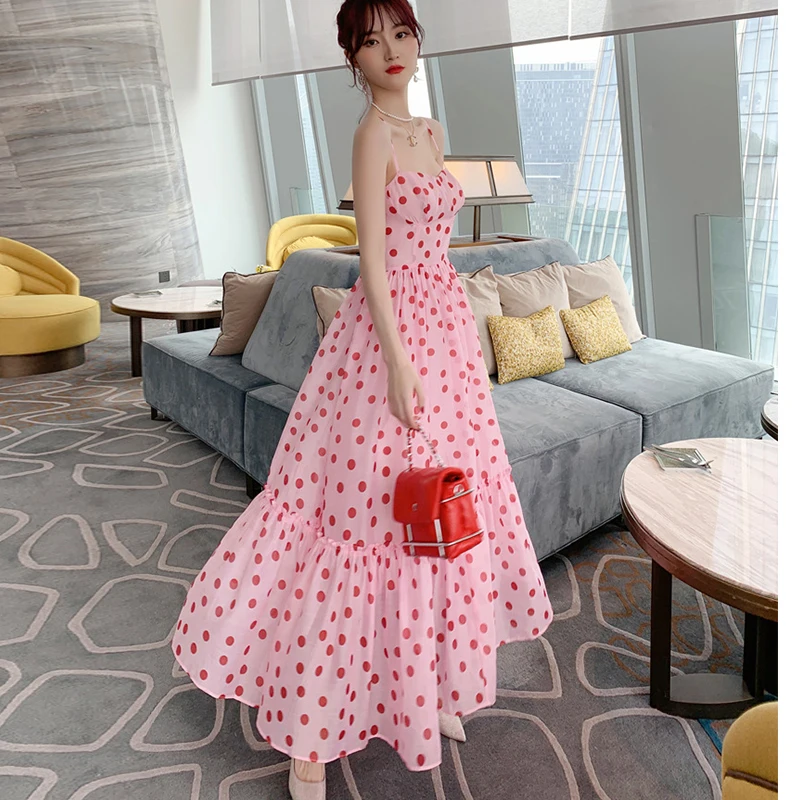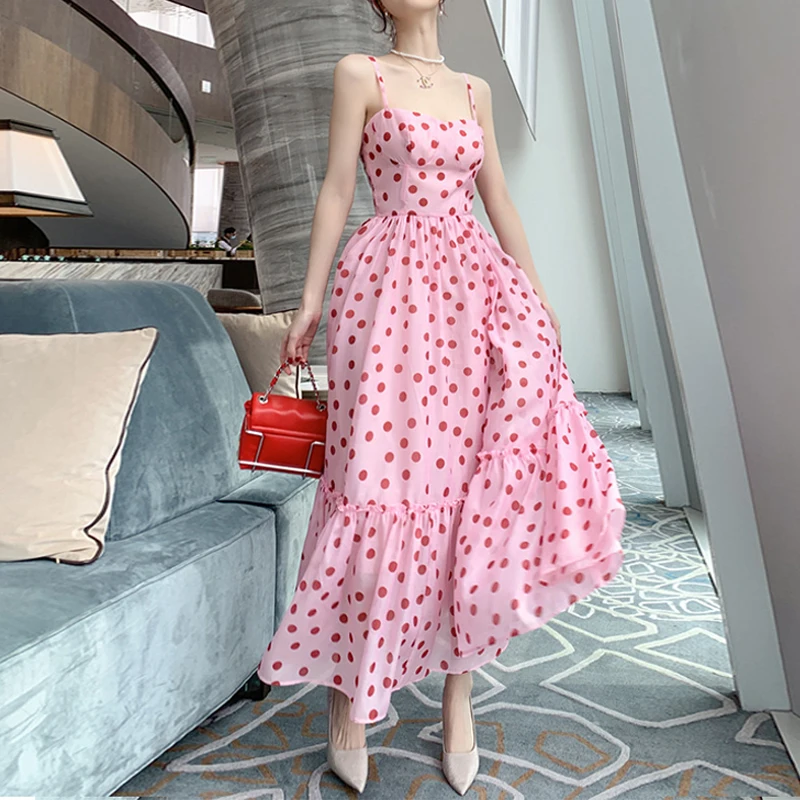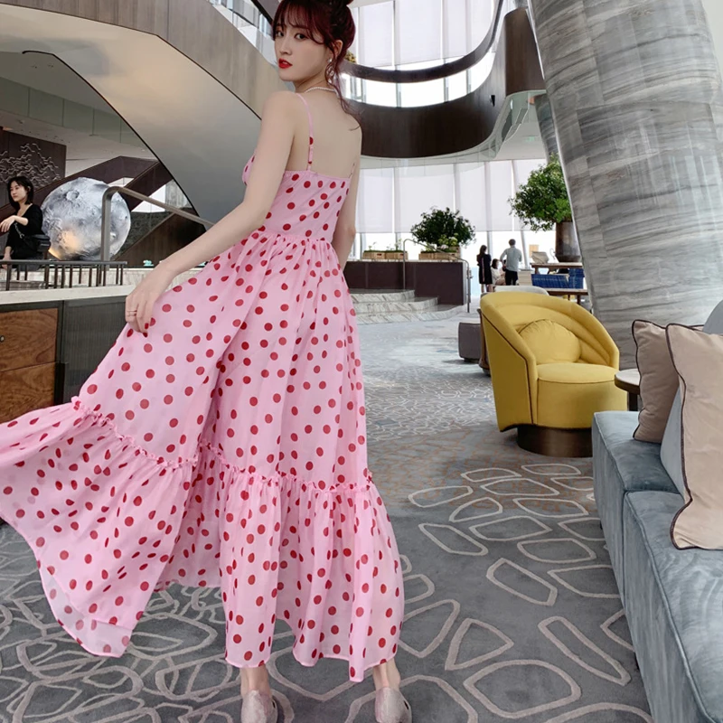 Женское шифоновое платье в горошек, элегантное привлекательное розовое пляжное праздвечерние чное длинное платье без бретелек с оборками, ...