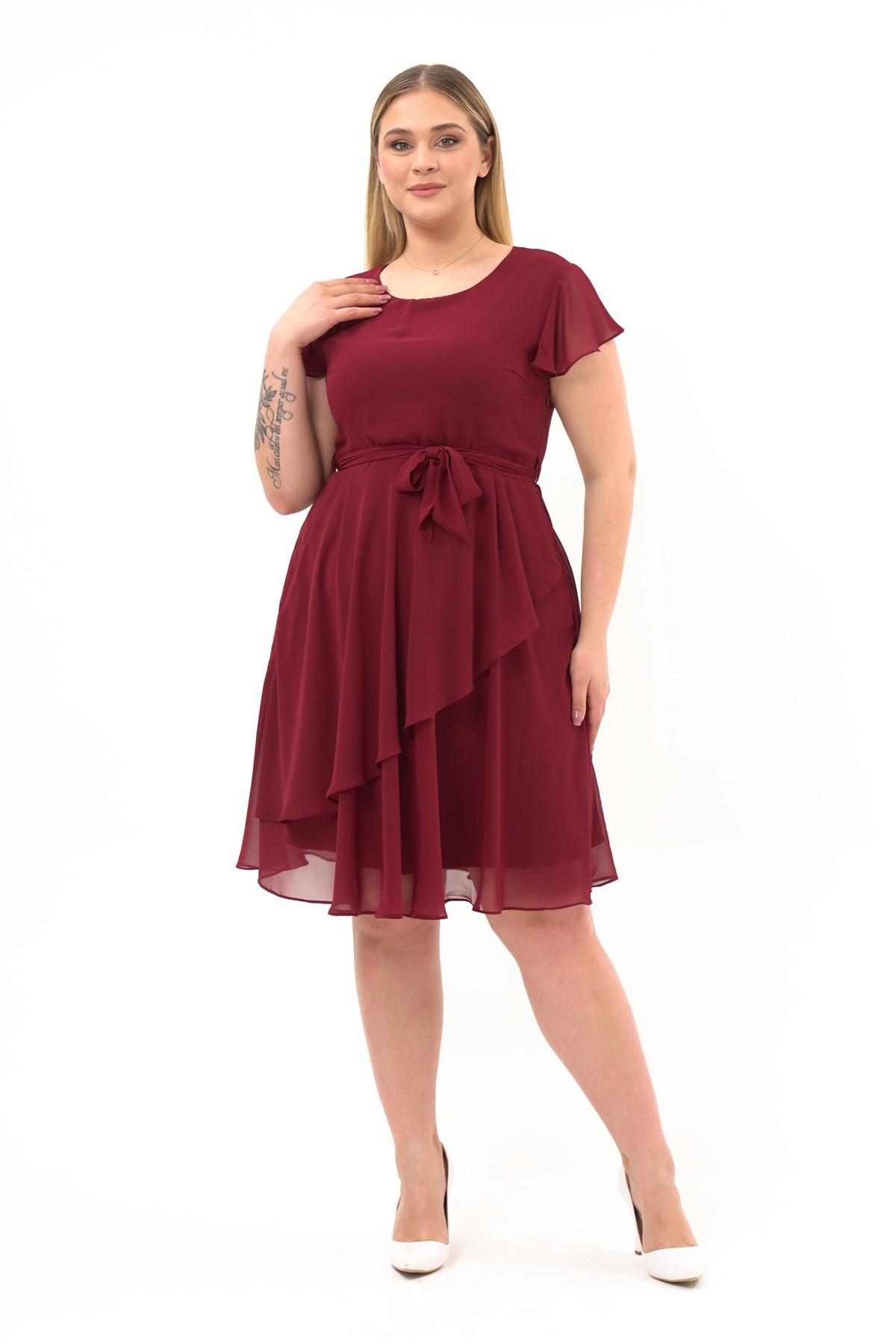 Женское шифоновое платье миди с круглым вырезом и воланами большого размера 4337/110 39 бордовый