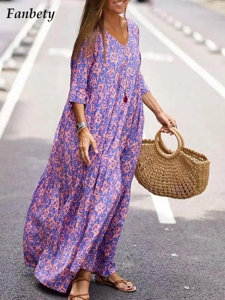 Женское элегантное вечернее платье вечерние цветочным принтом, Новое Модное Длинное Платье с V-образным вырезом, женское повседневное пляж...
