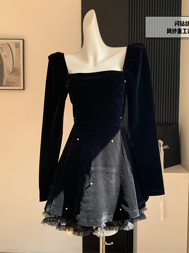 Женское элегантное платье для выпускного вечера, Осеннее черное ТРАПЕЦИЕВИДНОЕ ПЛАТЬЕ с квадратным вырезом, уличная одежда Y2K, платье в стиле пэчворк для торжественных случаев