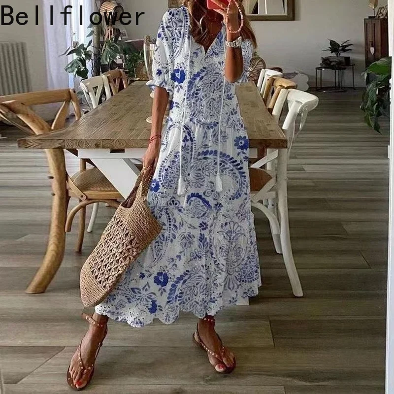 Женское элегантное сексуальное с v-образным вырезом с принтом длинное платье для женщин Пляжный Стиль A-Line Рукав «фонарик» Лето размера плюс...