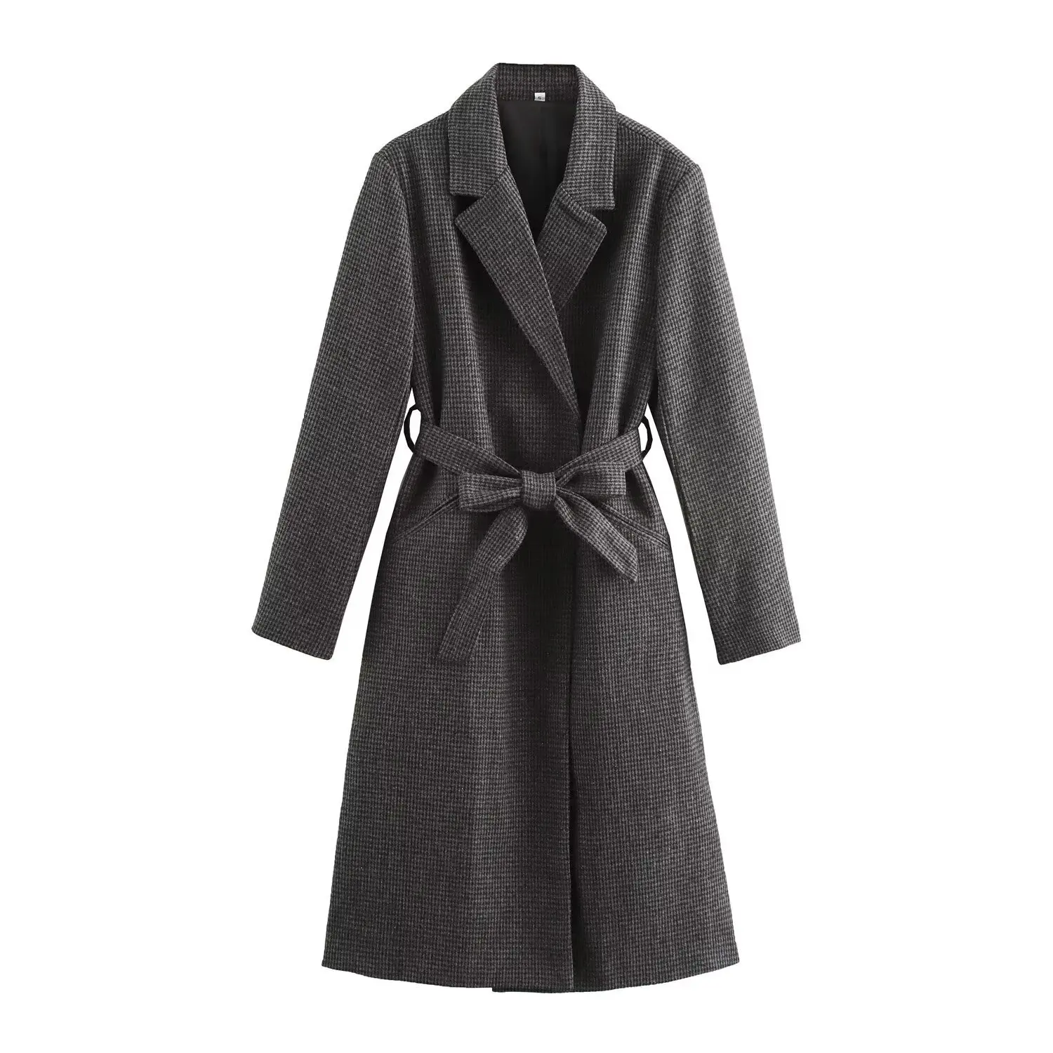 Женское элегантное шерстяное пальто в клетку средней длины выше колена серого цвета на шнуровке универсальная осенне-зимняя модная верхняя одежда