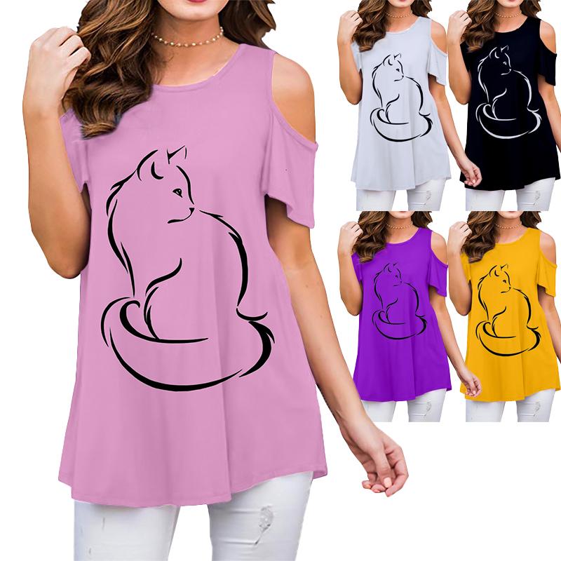 Женщины Короткий рукав Экипаж Шея с плеча Рубашка Многоцветная линия Кошка Животное Кошка Печать Футболка Пуловер Топ
