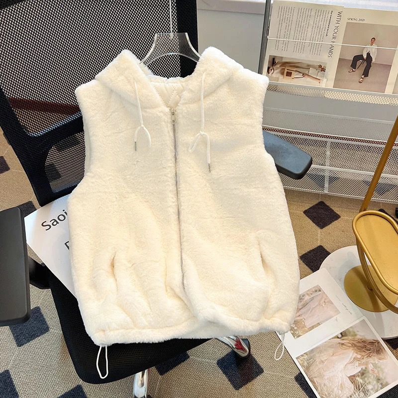 Жилет с капюшоном из искусственного кроличьего меха, женское однотонное пальто из искусственного меха, повседневное пальто без рукавов, плюшевая мягкая молния, свободная осенне-зимняя теплая верхняя одежда