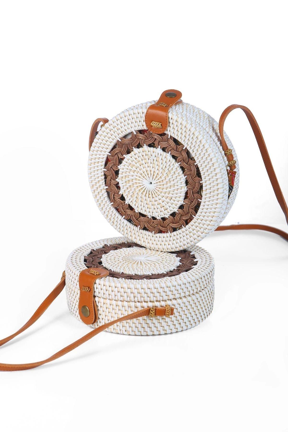 Жіноча стильна та корисна сумка через плече Ротангова шкіряна ручна робота на ремінці Плетена кругла сумка через плече Екрю Коричнева