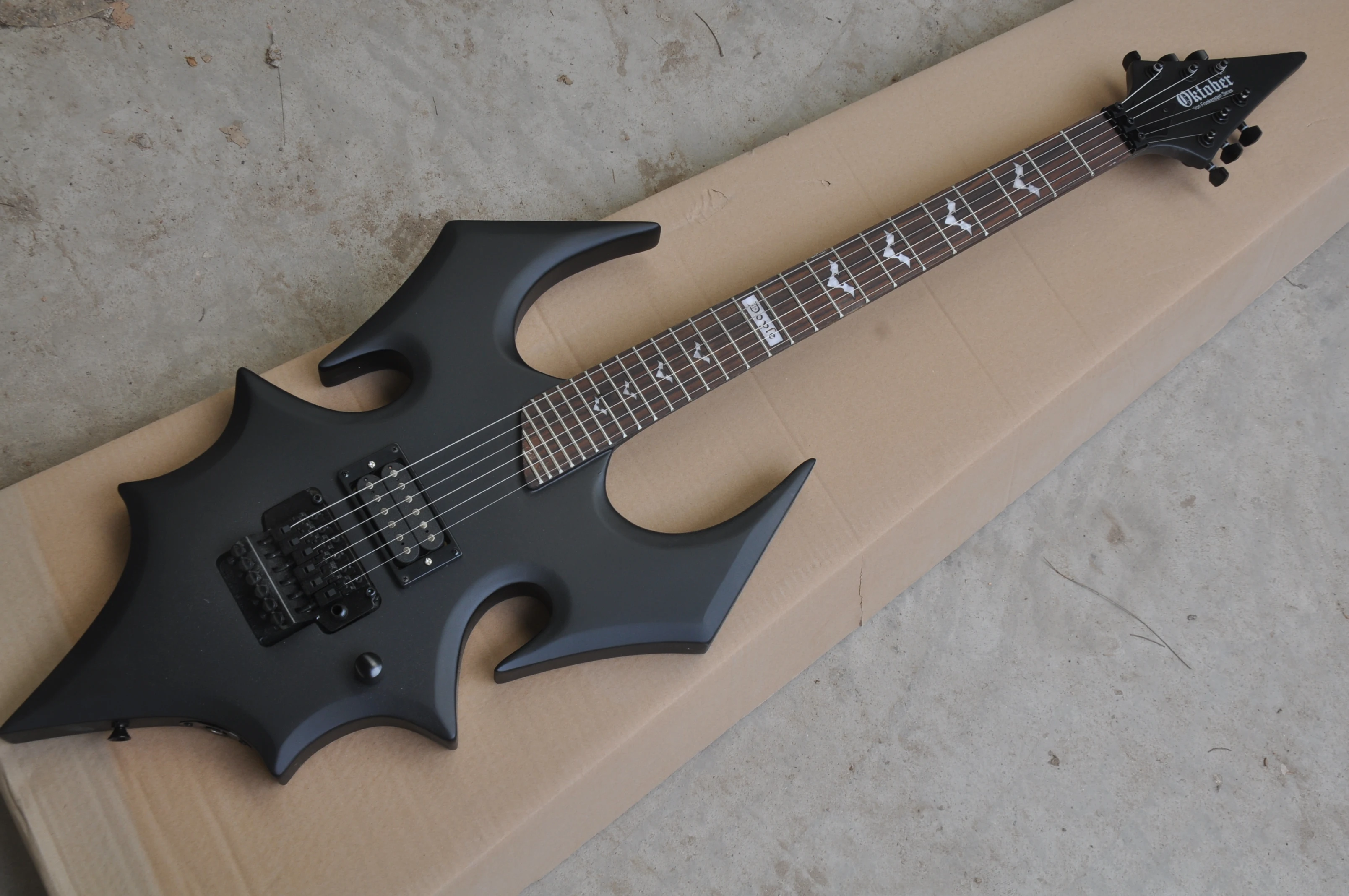 Заводская изготовленная на заказ необычная матовая черная электрическая гитара в форме летучей мыши с подставкой из розового дерева, инкру...