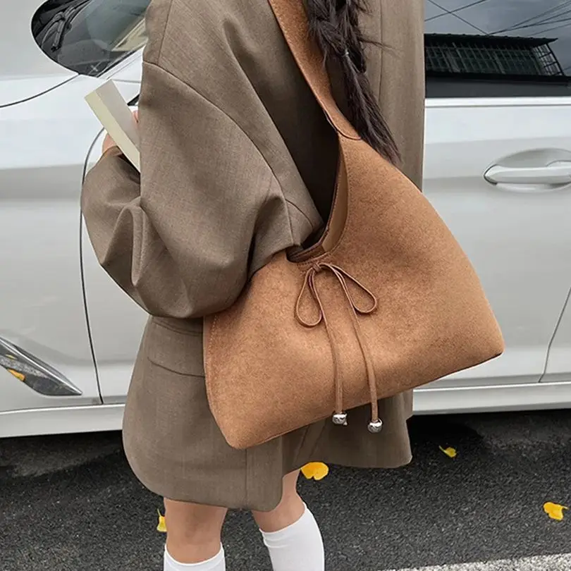 Замшевая большая сумка в стиле ретро, женская осень-зима 2025 года, дизайнерская сумка на плечо с бантом, мягкая большая вместительная сумка для подмышек
