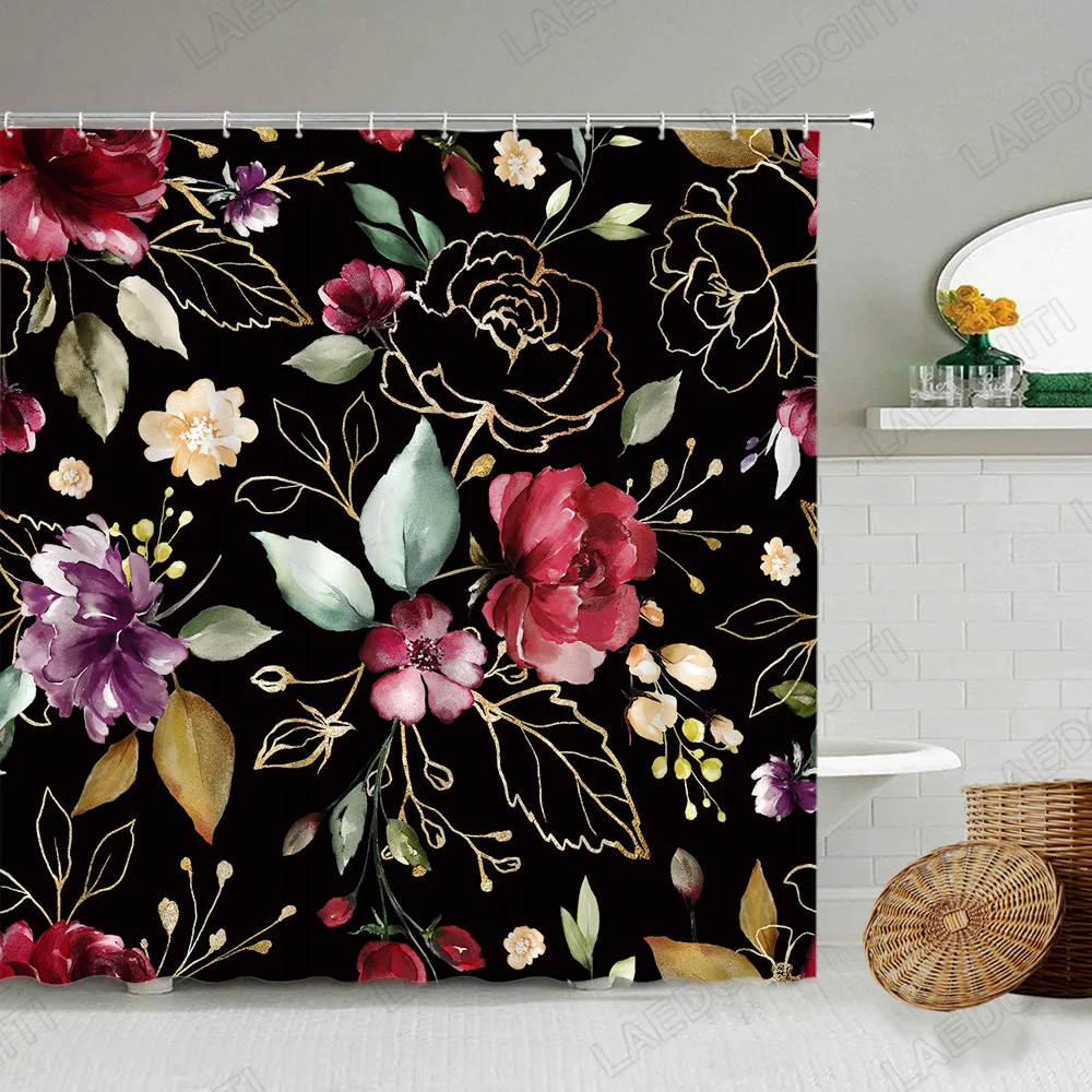 Занавеска для душа с цветочным принтом, абстрактная Золотая, розовая, красная, желтая, акварельная, с цветами и растениями, современный ткан...