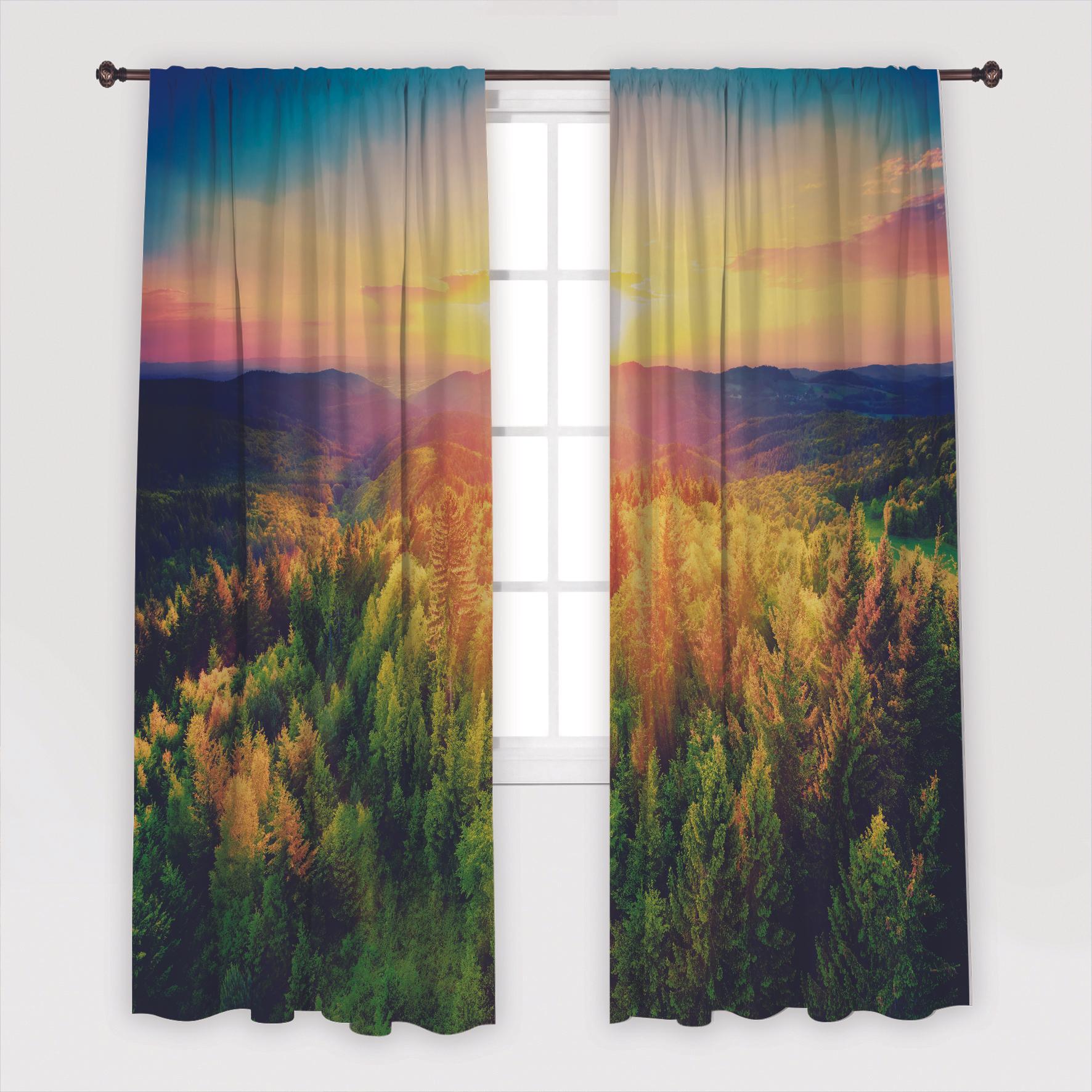 Занавески/шторы с пейзажным принтом для гостиной, столовой, спальни с комплектом из 2 панелей — несколько размеров, вид на закат над лесными холмами, зеленый