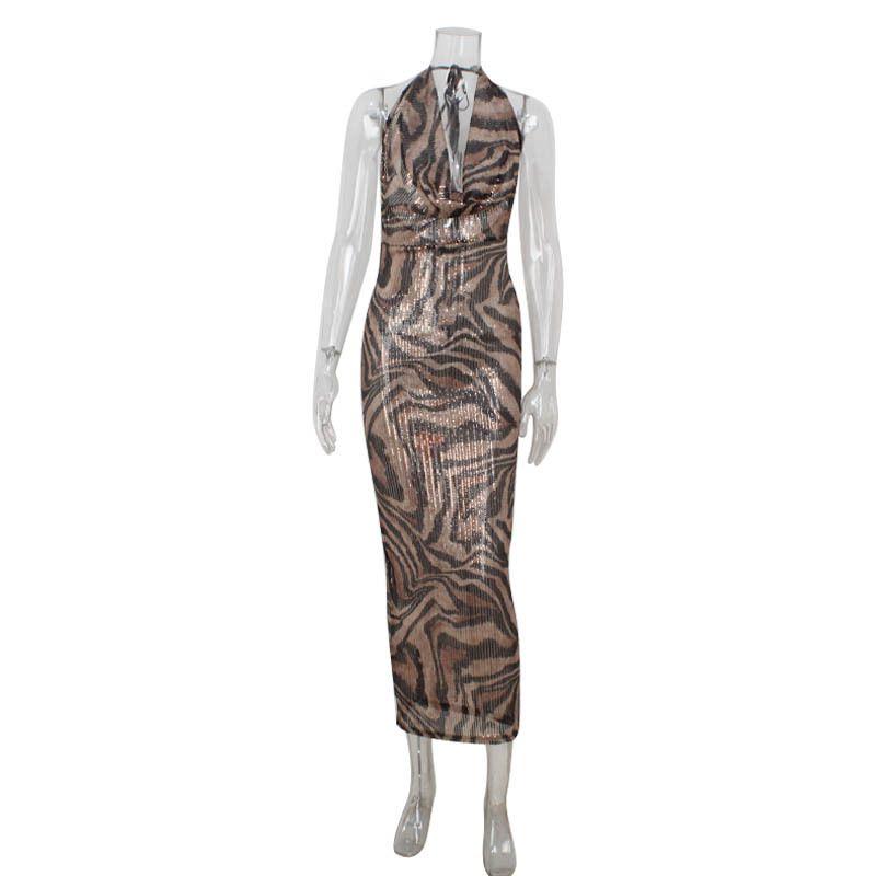 Западный стиль Инс Новая мода С подвеской на шее Глубокий V Леопардовый принт Длинное платье Сексуальное с открытой спиной С высокой талией Платье-футляр Вечернее платье Платье Leopard print L